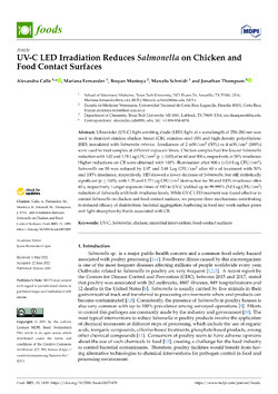 UV-C LED Irradiation Reduces Salmonella on Chicken and Food Contact Surfaces